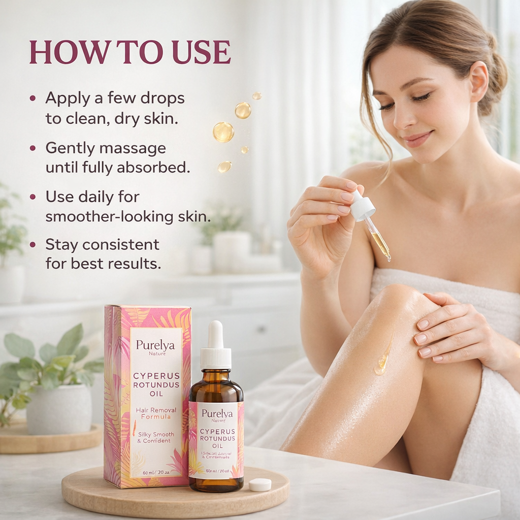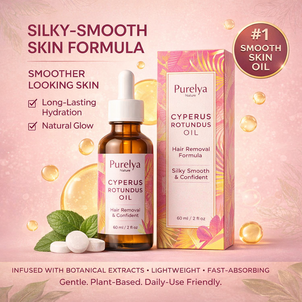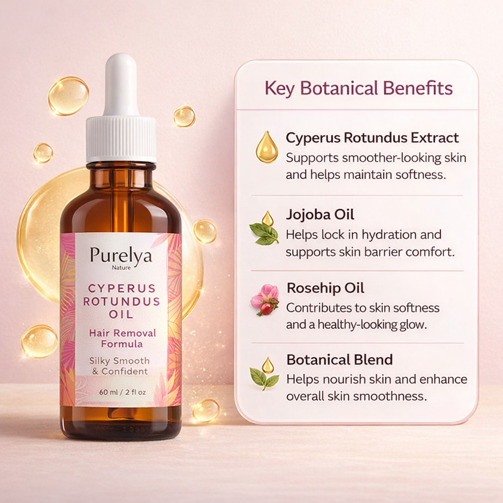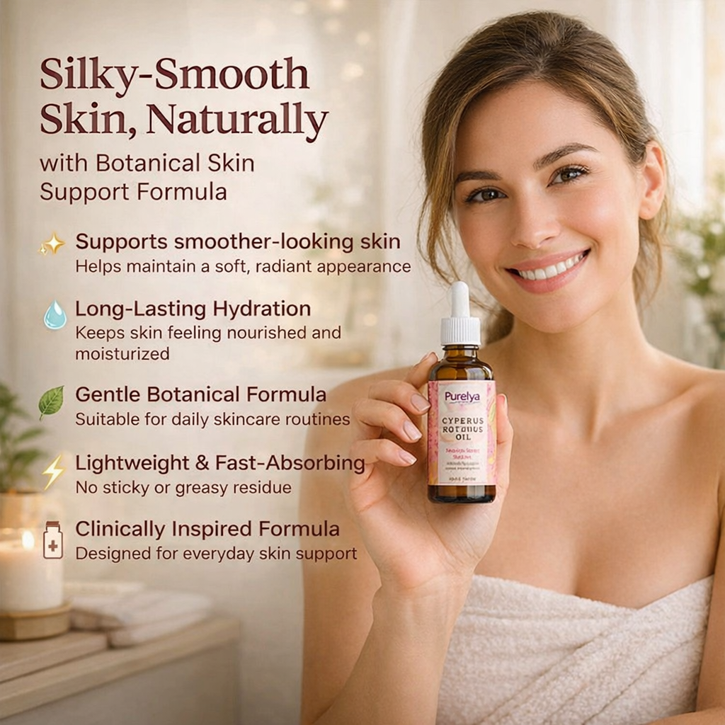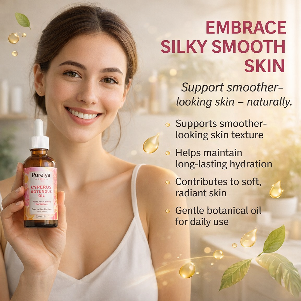 Purelya Cyperus Rotundus Oil is a lightweight, plant-based skincare oil designed to support smoother-looking, softer skin.