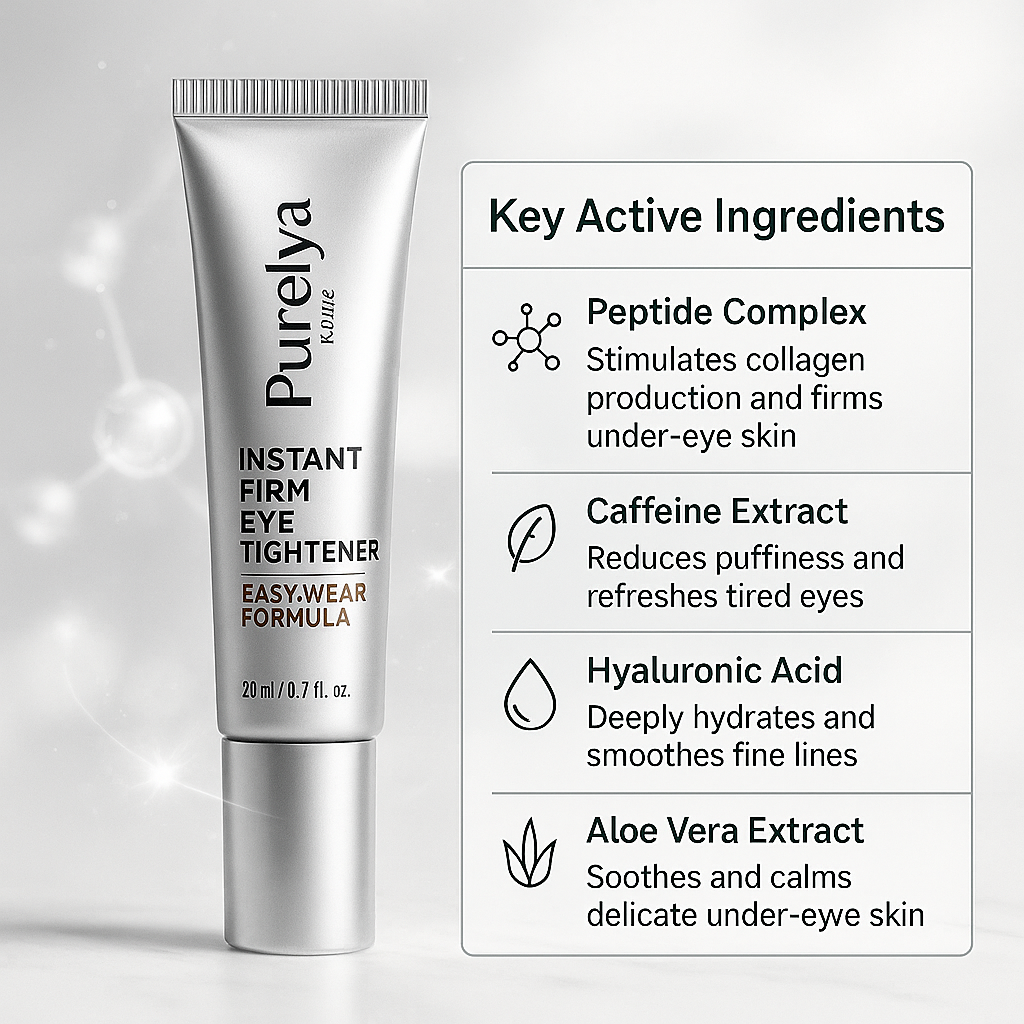 Purelya Nature Instant Firm Eye Tightener is a breakthrough, dermatologist-inspired formula that visibly lifts, firms, and smooths under-eye skin in just minutes. Powered by peptides, caffeine, and hyaluronic acid, it targets puffiness, wrinkles, and sagging skin for an instantly refreshed, youthful look.