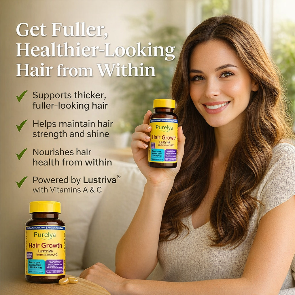 Purelya Nature Hair Growth Lustriva features Lustriva®, a clinically studied blend of biotin and bioavailable silicon that supports hair health from within. It helps maintain hair strength, smoothness, and a fuller-looking appearance as part of your daily wellness routine.