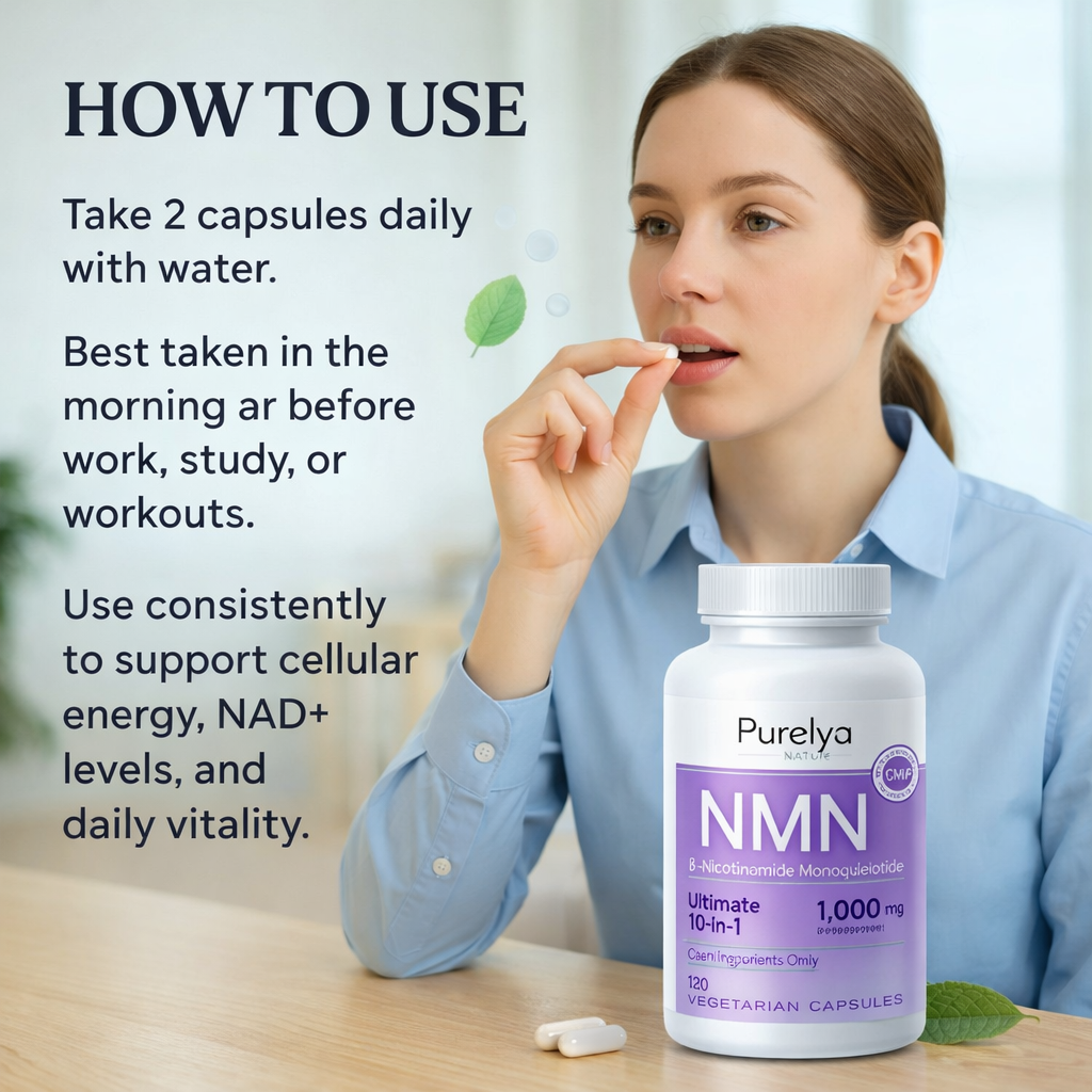 Purelya Nature NMN provides β-Nicotinamide Mononucleotide (NMN) in a 1,000 mg per serving formula designed to support your body at the cellular level. NMN helps maintain NAD⁺, which your cells use for energy, normal repair, and healthy aging—supporting how you feel each day.