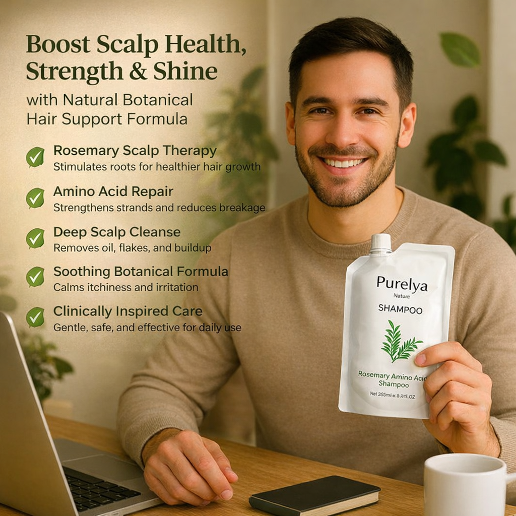 Purelya Nature Rosemary Amino Acid Shampoo gently cleanses the scalp while helping maintain comfort and balance. By removing oil, buildup, and impurities, it supports a fresh, healthy-feeling scalp and stronger-looking hair from the roots. The blend of rosemary and amino acids helps keep hair soft, light, and refreshed—without harsh stripping or heaviness.