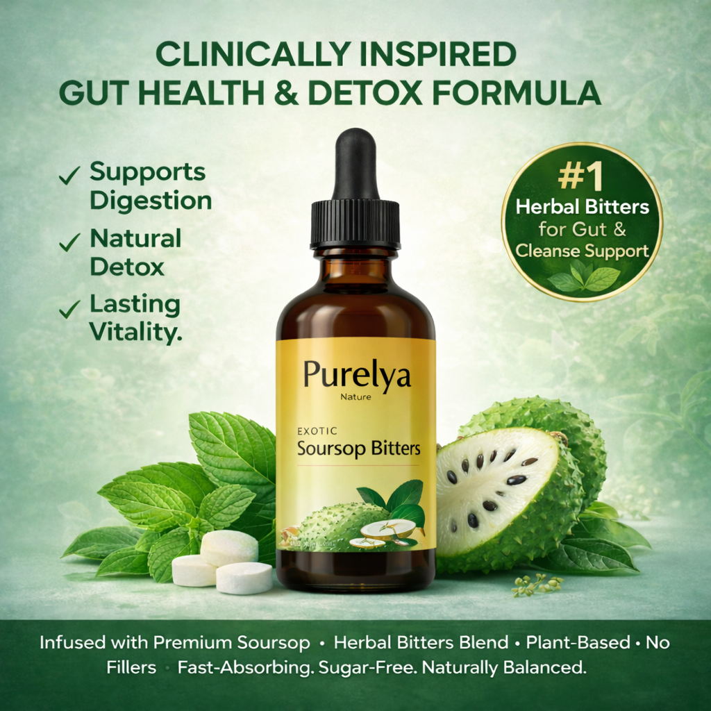 Purelya Nature Exotic Soursop Bitters combines soursop and herbal bitters to support digestive comfort, internal balance, and everyday vitality.